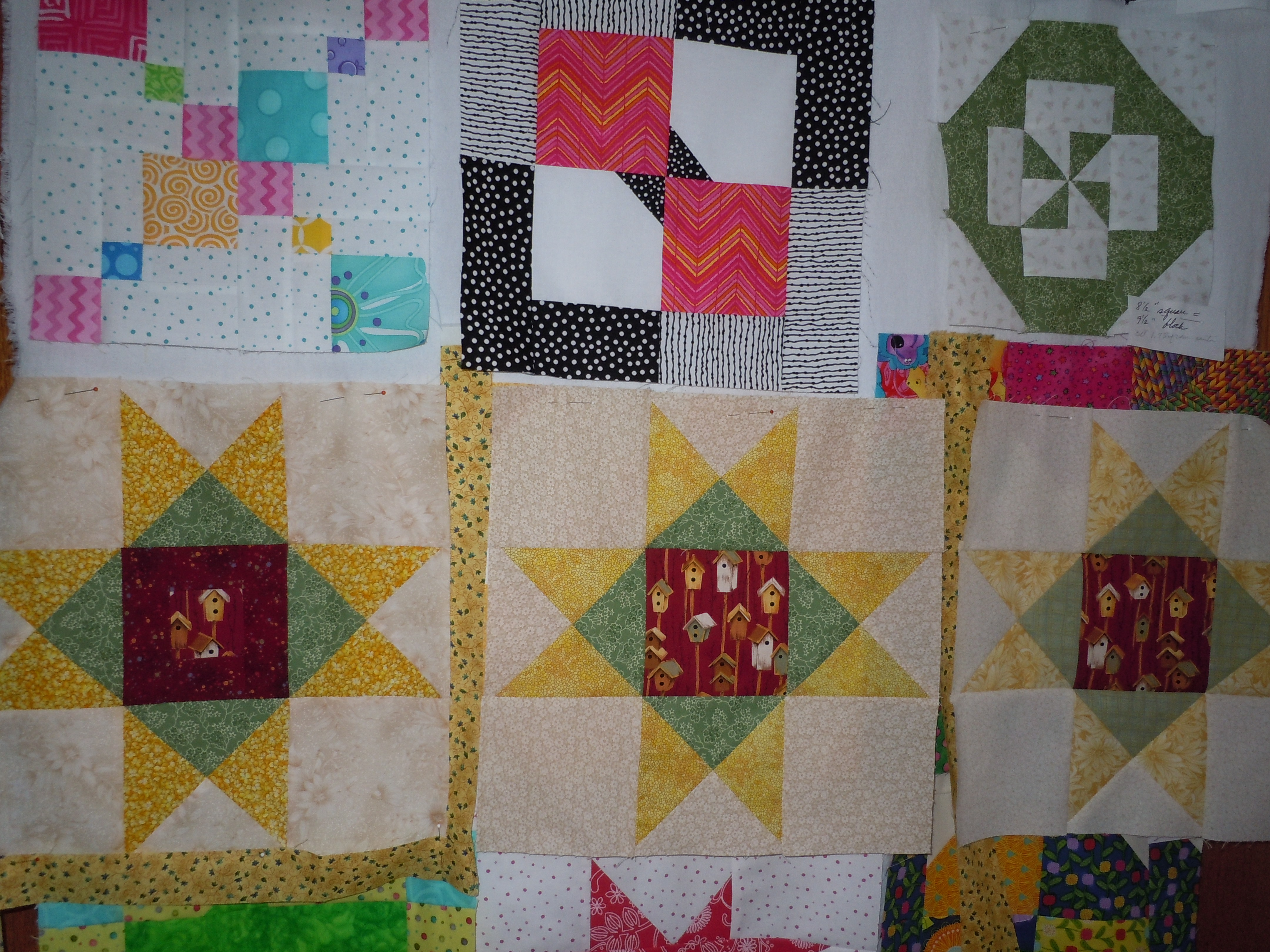 My design board has blocks pinned on top of blocks but the yellow star blocks are closer to being a top 🙂  The top left went into a quilt that was donated to Ronald McDonald House last January, another version of the Disappearing Nine Patch.  The Black, White and Red is going to be a quilt, the fabric is waiting patiently 🙂