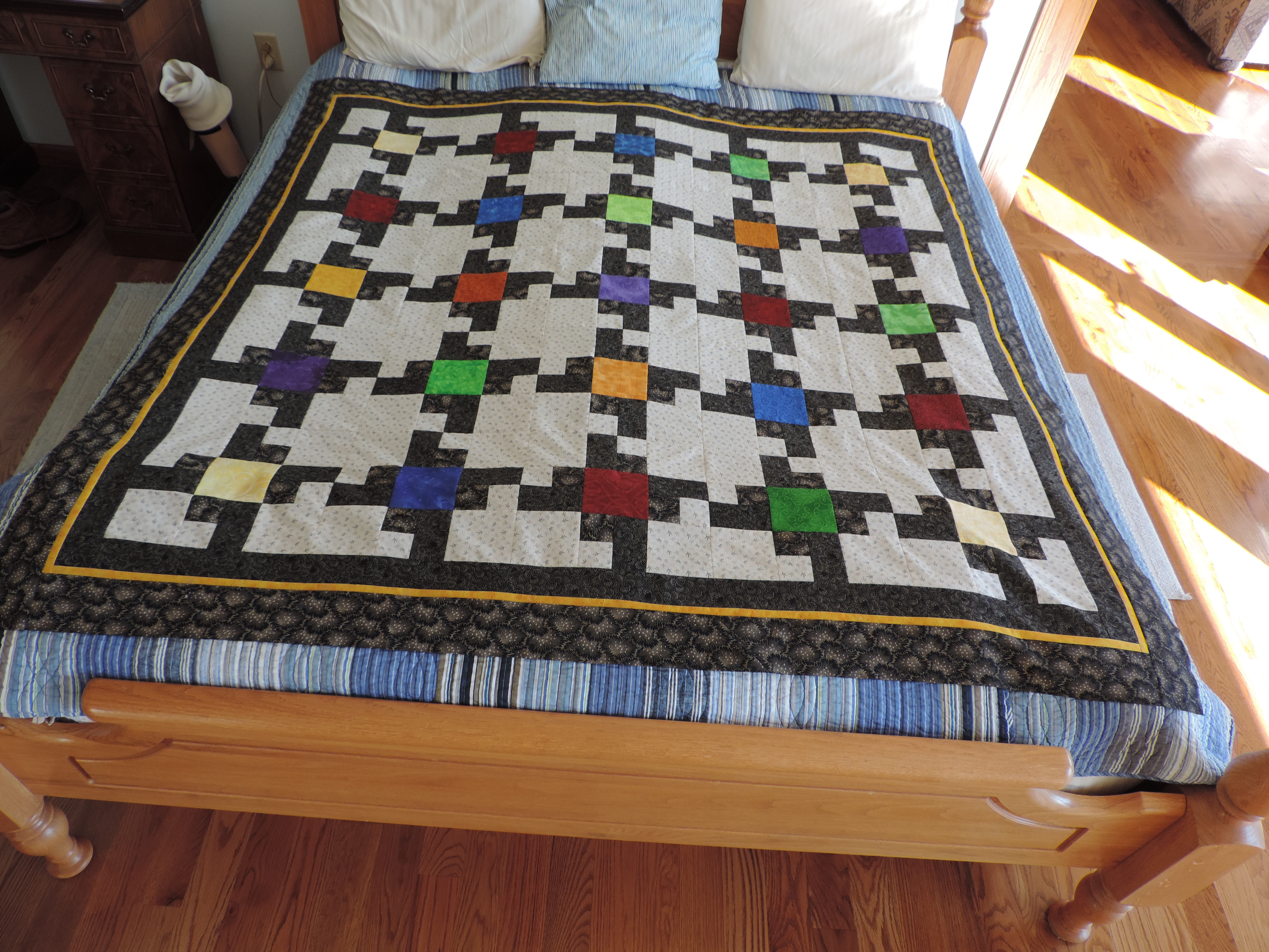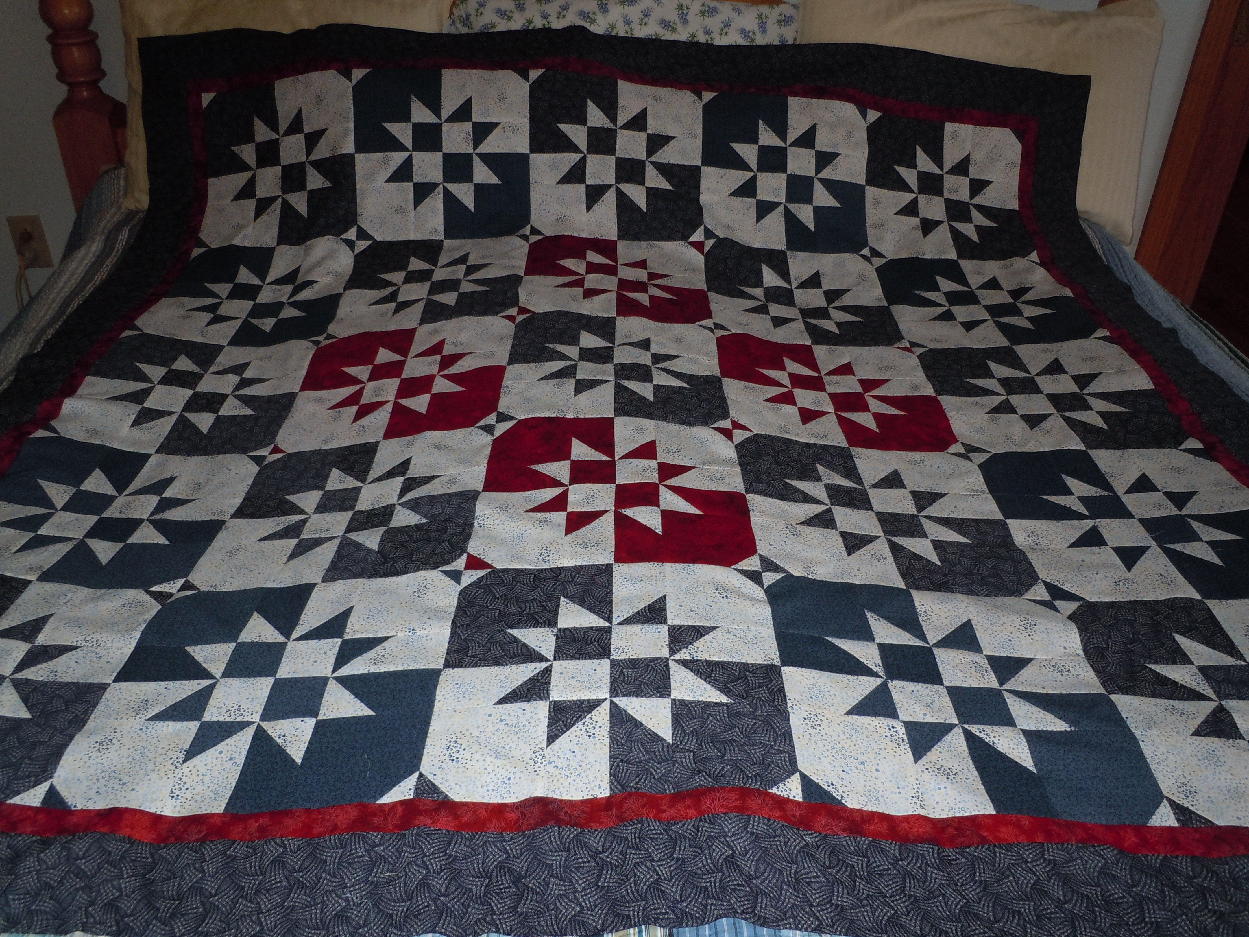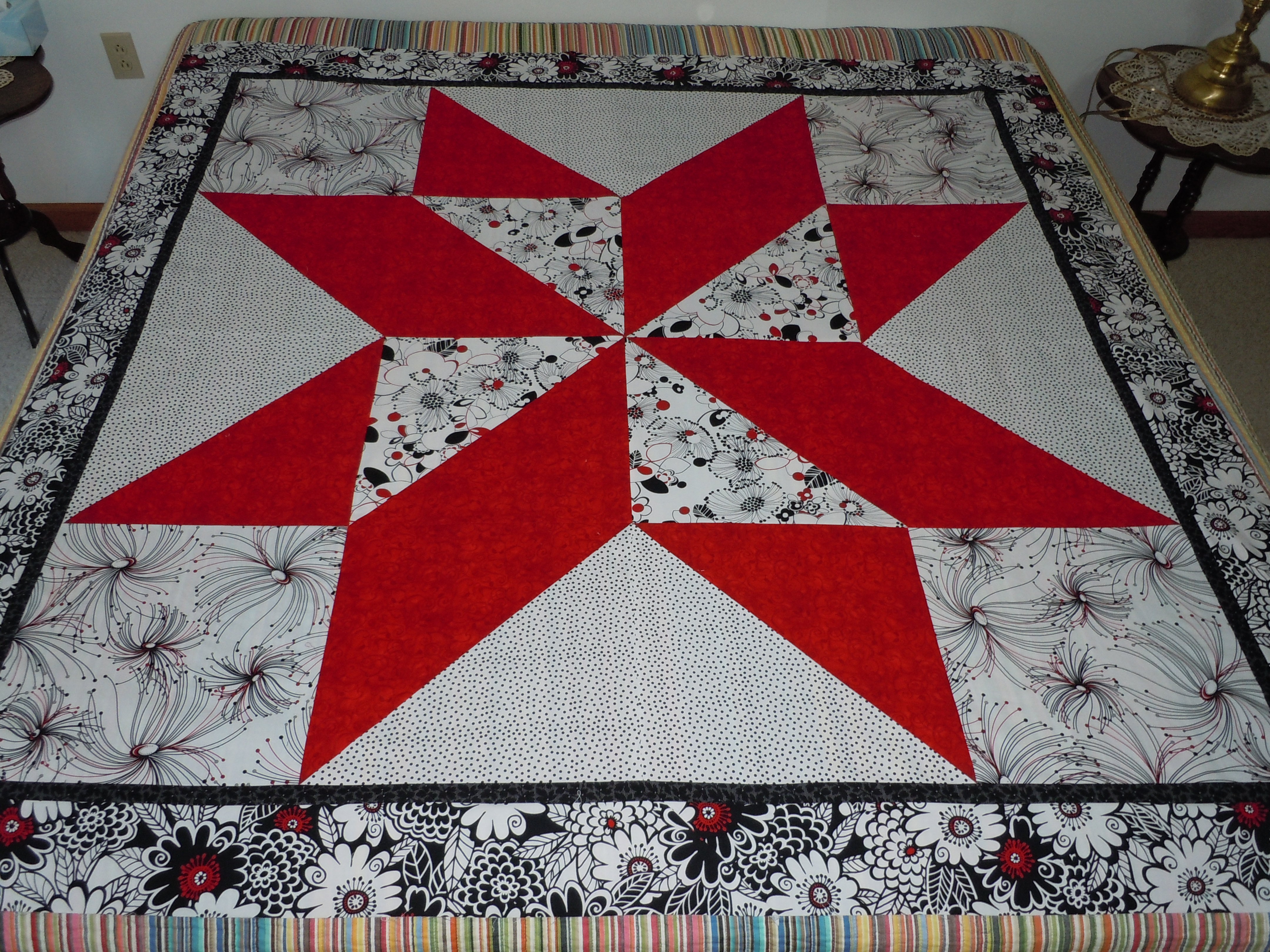 And now for my last act for the day …. Winter Solace has her borders. I think it really made a difference. The star seemed to run off the quilt, so I had to fence it in 🙂  These black and whites were left over from a couple of things I made for the Dallas MS fund raiser my friend Wendy worked on a couple of years ago.  This is on a king bed and covers the entire top!  It will be a challenge to quilt.