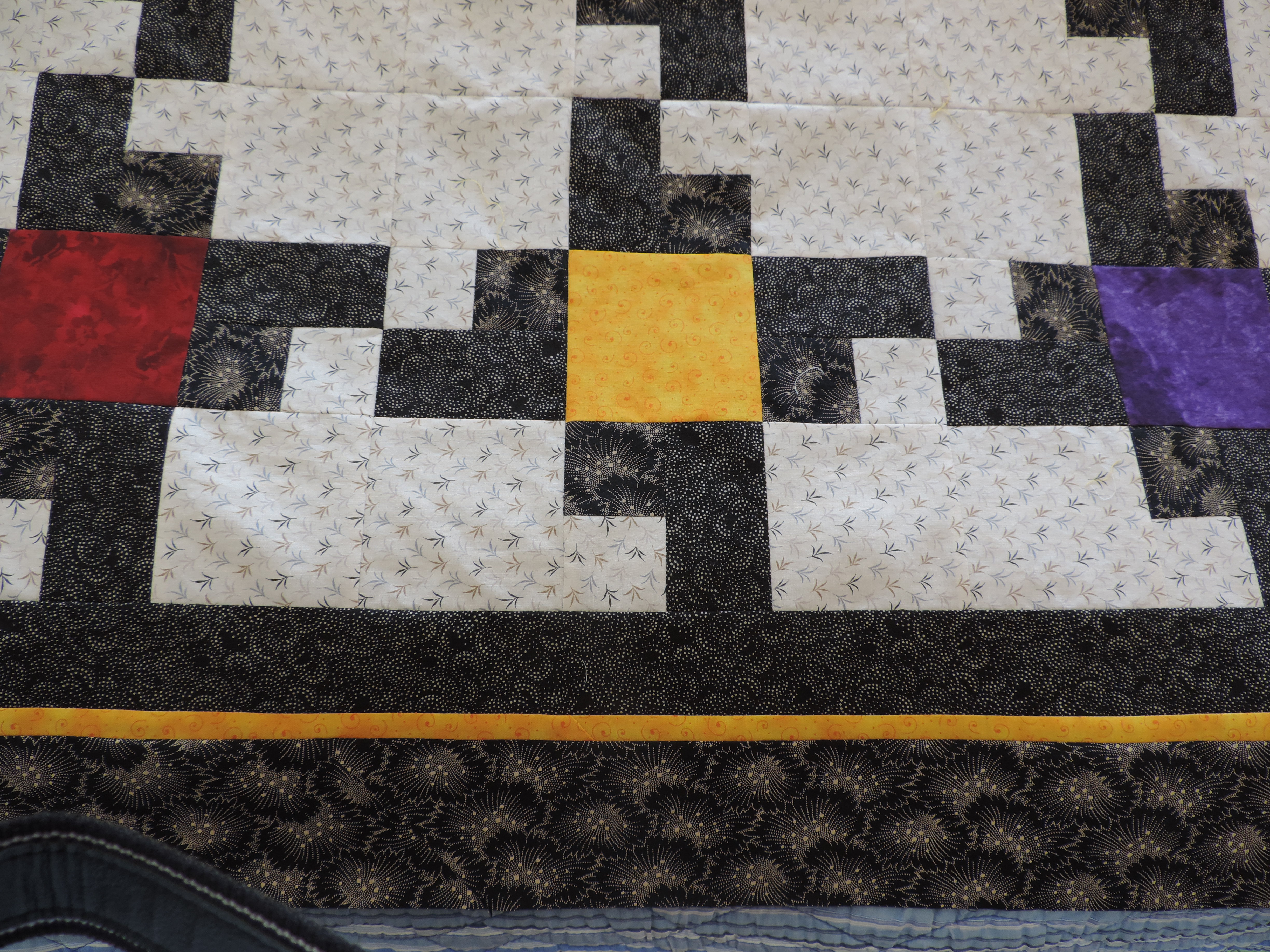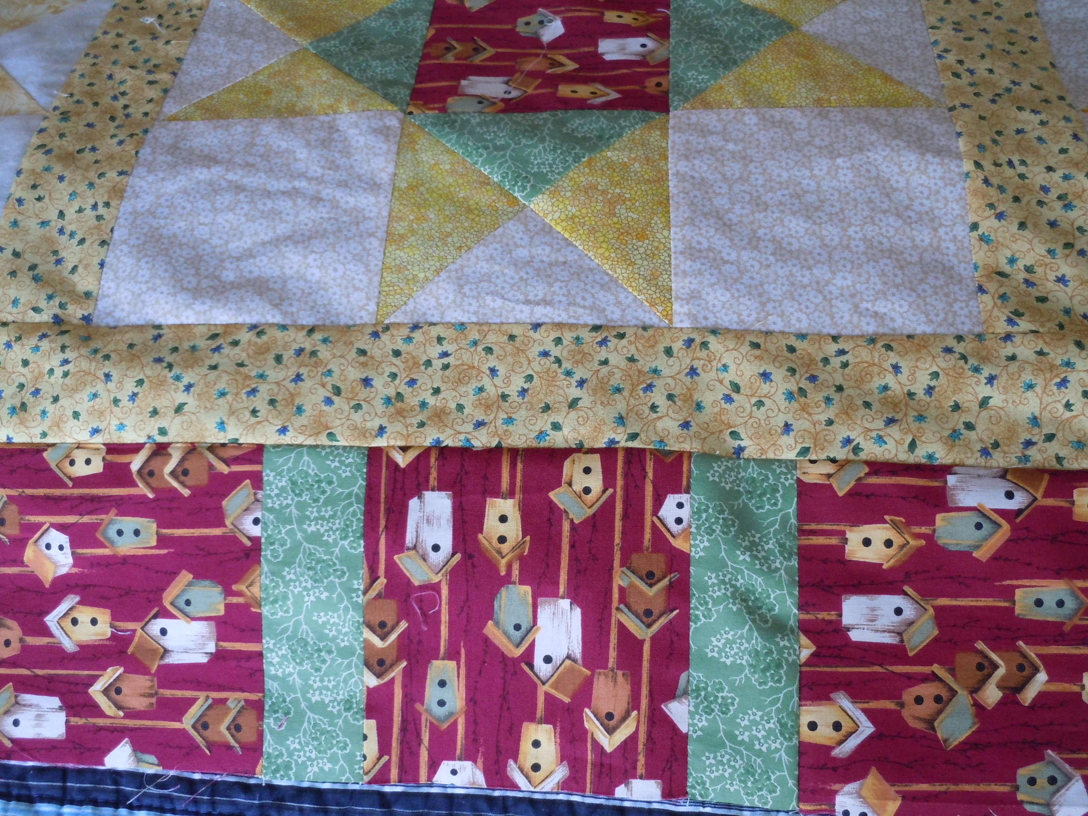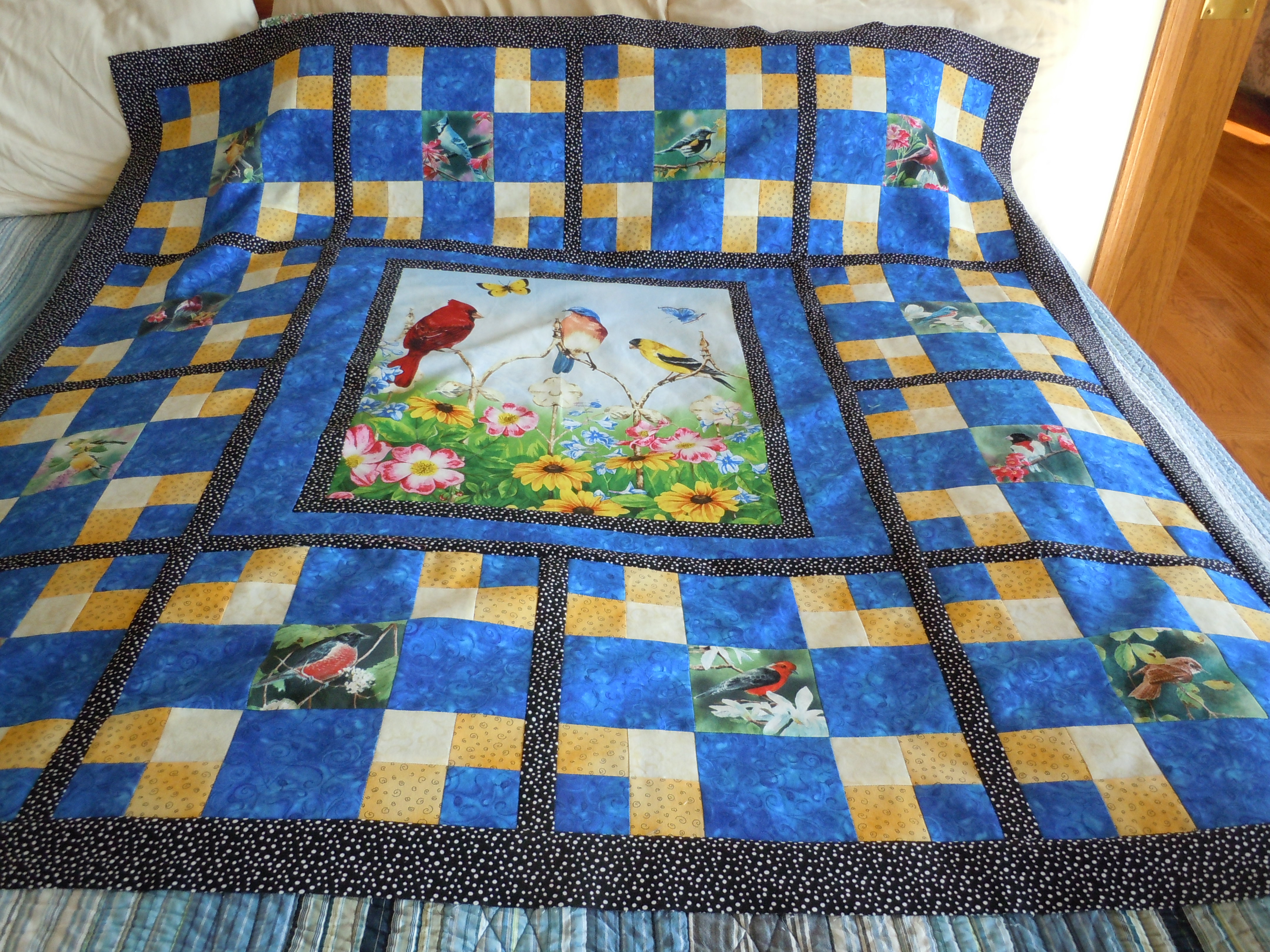 I’m so pleased with my brother Jimmie’s quilt “Morning Song”. It’s a tribute to our mother at the same time as being a special gift to show him some special love. He’s been having health issues even worse than mine and we live too far apart for me to do much in the way of help. I think most quilters start making quilts for the sheer joy of being able to give warmth, love and encouragement through our heartfelt creations. I used pieces from 2 panels for the birds and it fell into place as if Mama was whispering in my ear. I love how the black looks like window panes. I think you could safely say, he loved it!DSCN0086