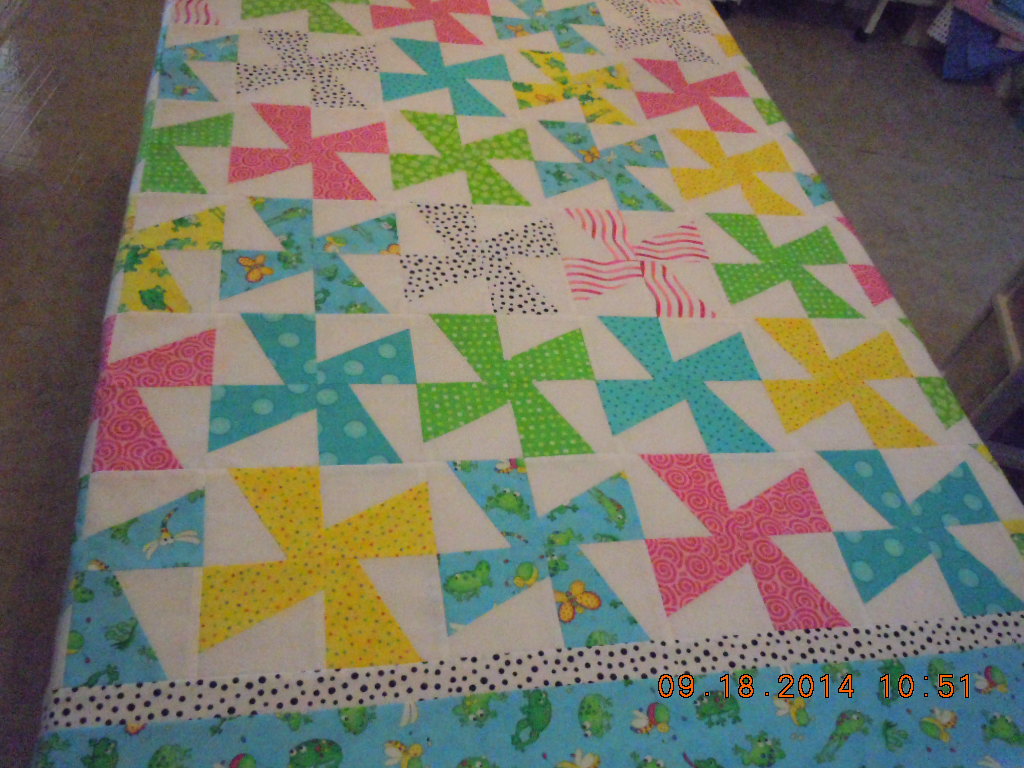 This little one went to Montana.  Isn’t it just too sweet?  Loved making the pinwheels so much I have a stack of about 150, in two sizes, that I put together while piecing other things, had them cut and instead of using a scrap for starting and stopping, I made blocks!  Coolest trick I’ve learned in a while.  (sorry, I took this picture before I pinned it for quilting, but you get the idea).