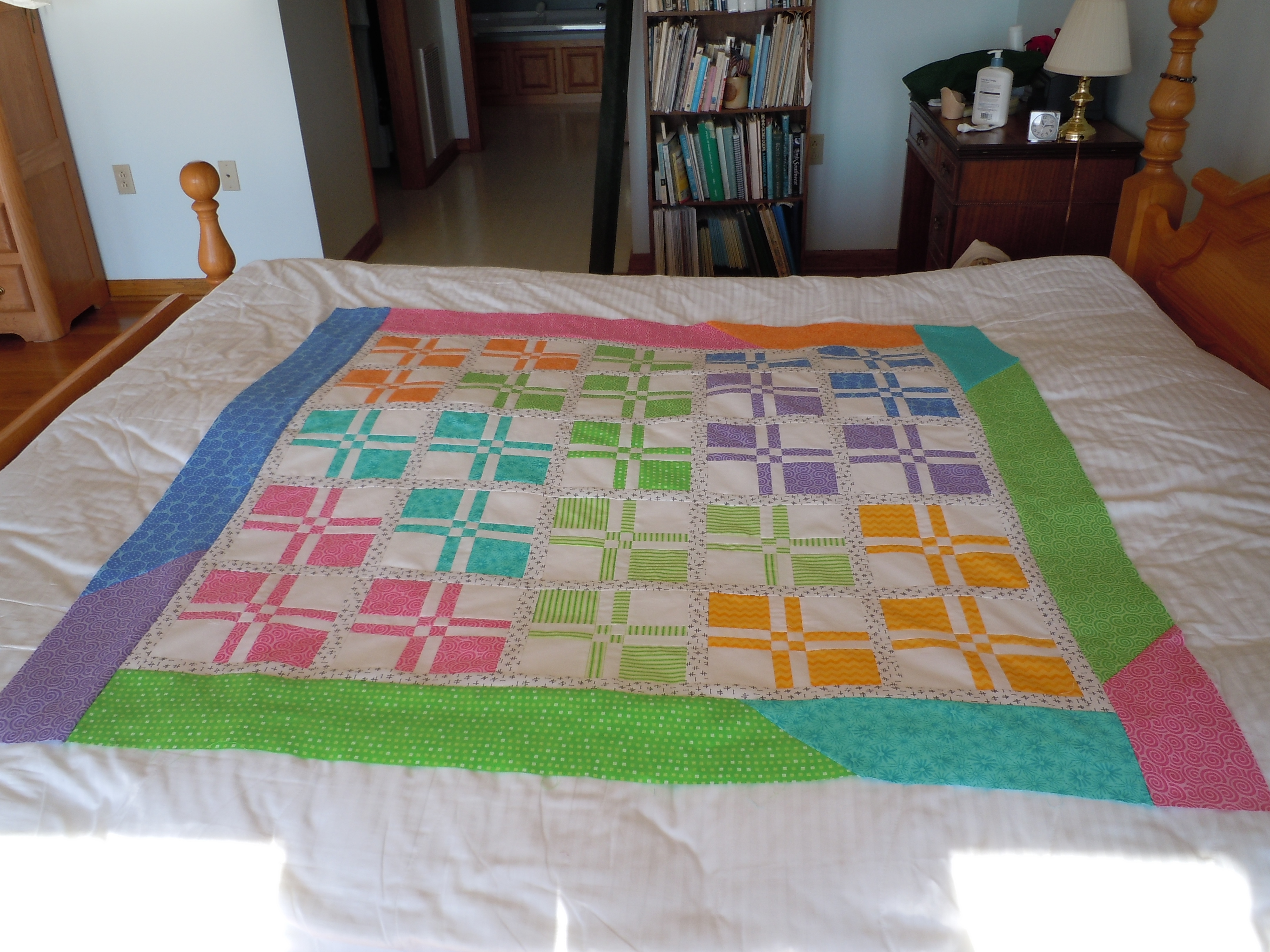 This purple one is another Disappearing Nine Patch pattern and I used fat quarters and scraps of some OLD Nancy Crow designs that I’ve been hoarding.  I love these colors together.  When you see this quilt ‘in person’ it glows.