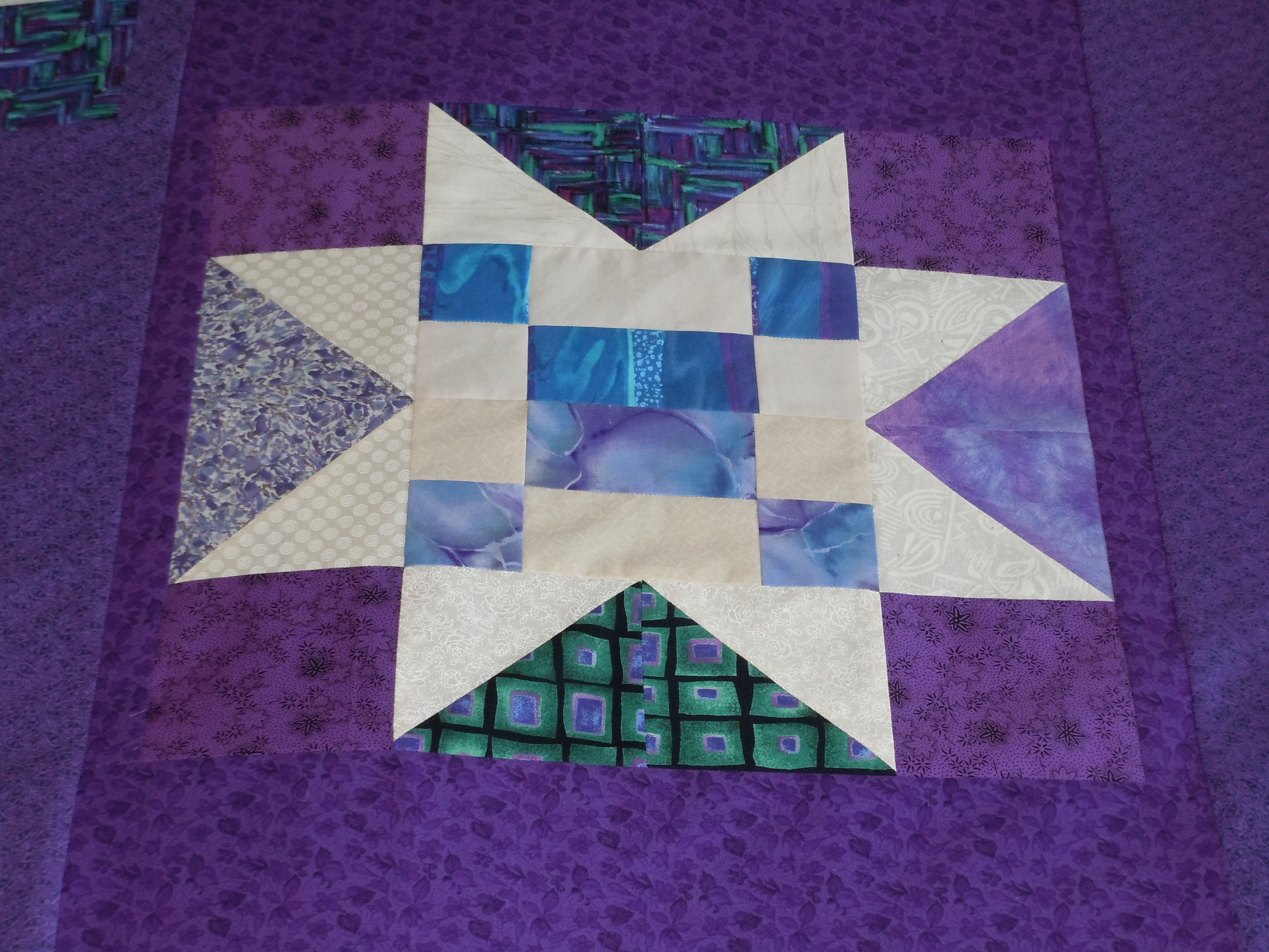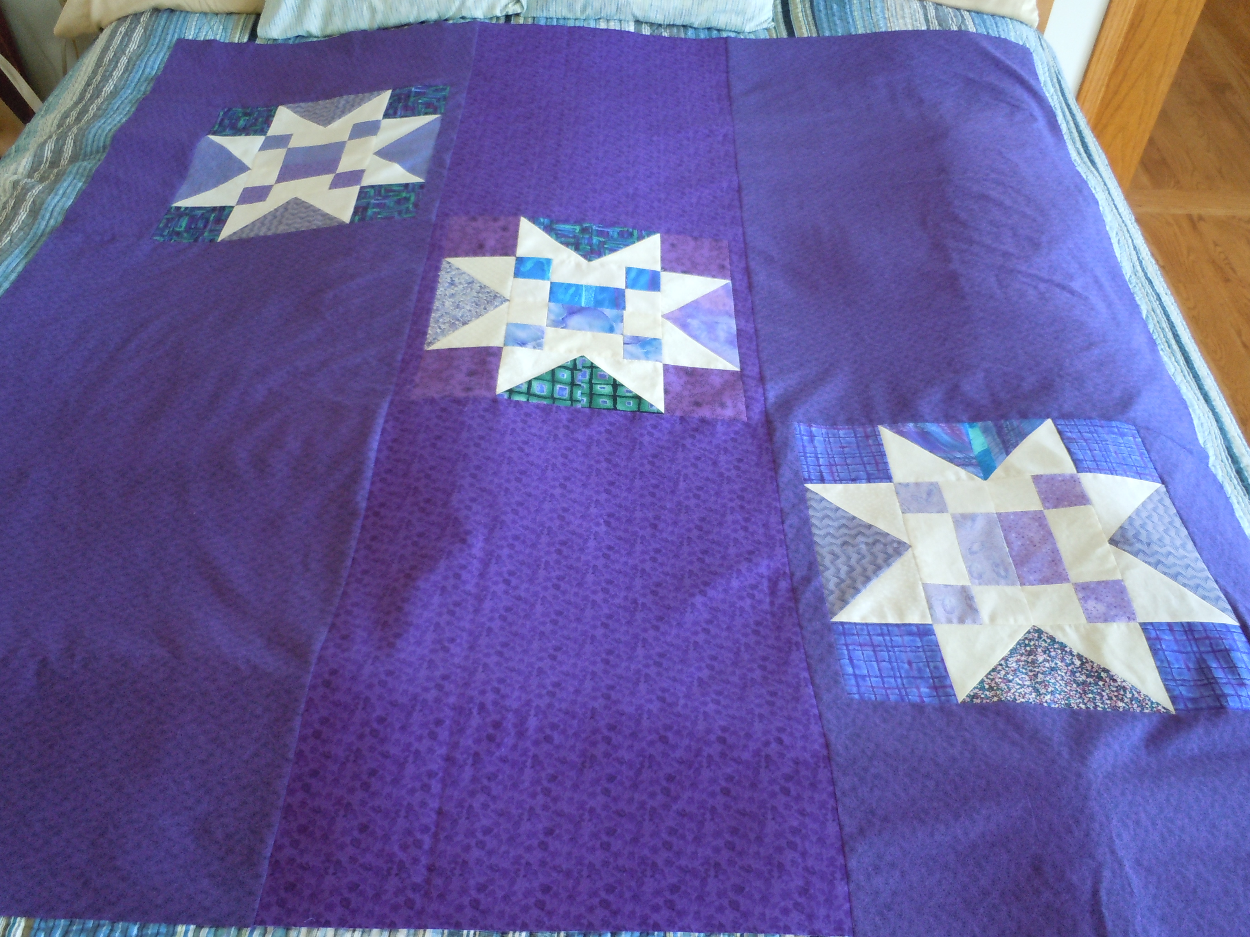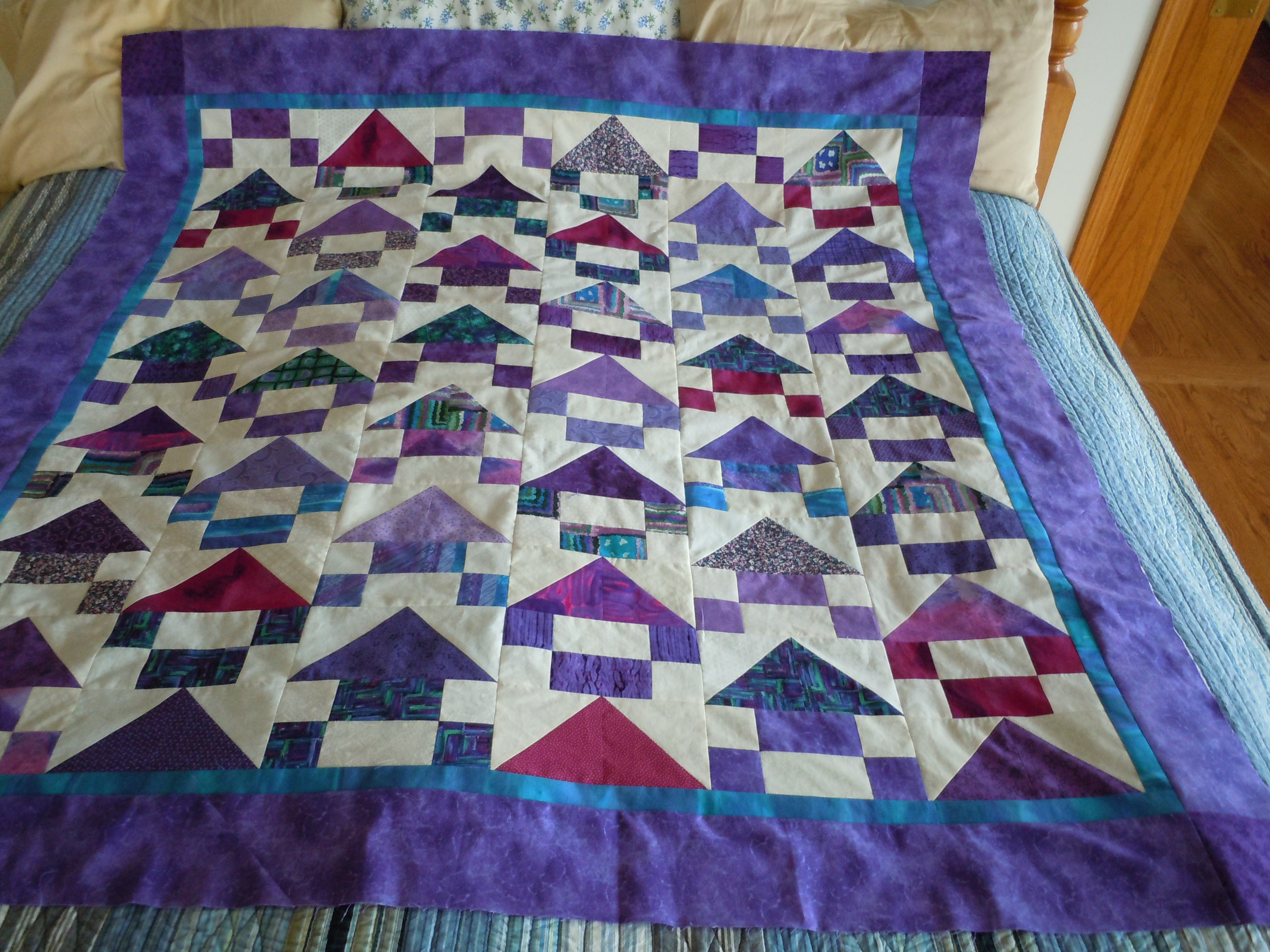 I just finished pinning “Mt. Hood – Maybe” from Pat Speth’s pattern.  Love the scrappy piecing and the colors really glow and remind me more of beach houses instead of mountains.  The back had to be pieced and what are you going to do with those odd blocks that wouldn’t fit into the front … (you probably remember the small one I did with the lighter colored purples last winter).  Makes me happy 🙂