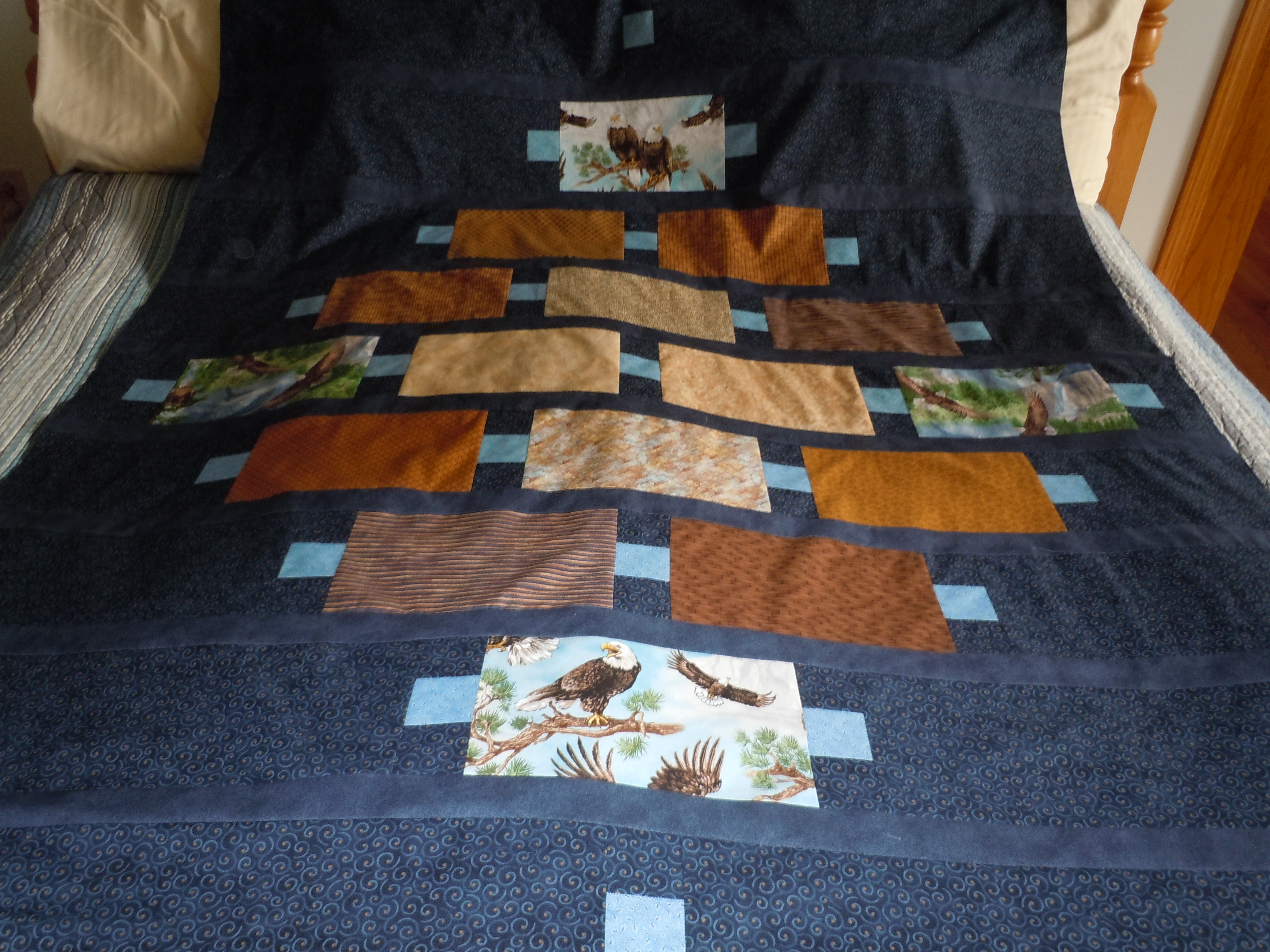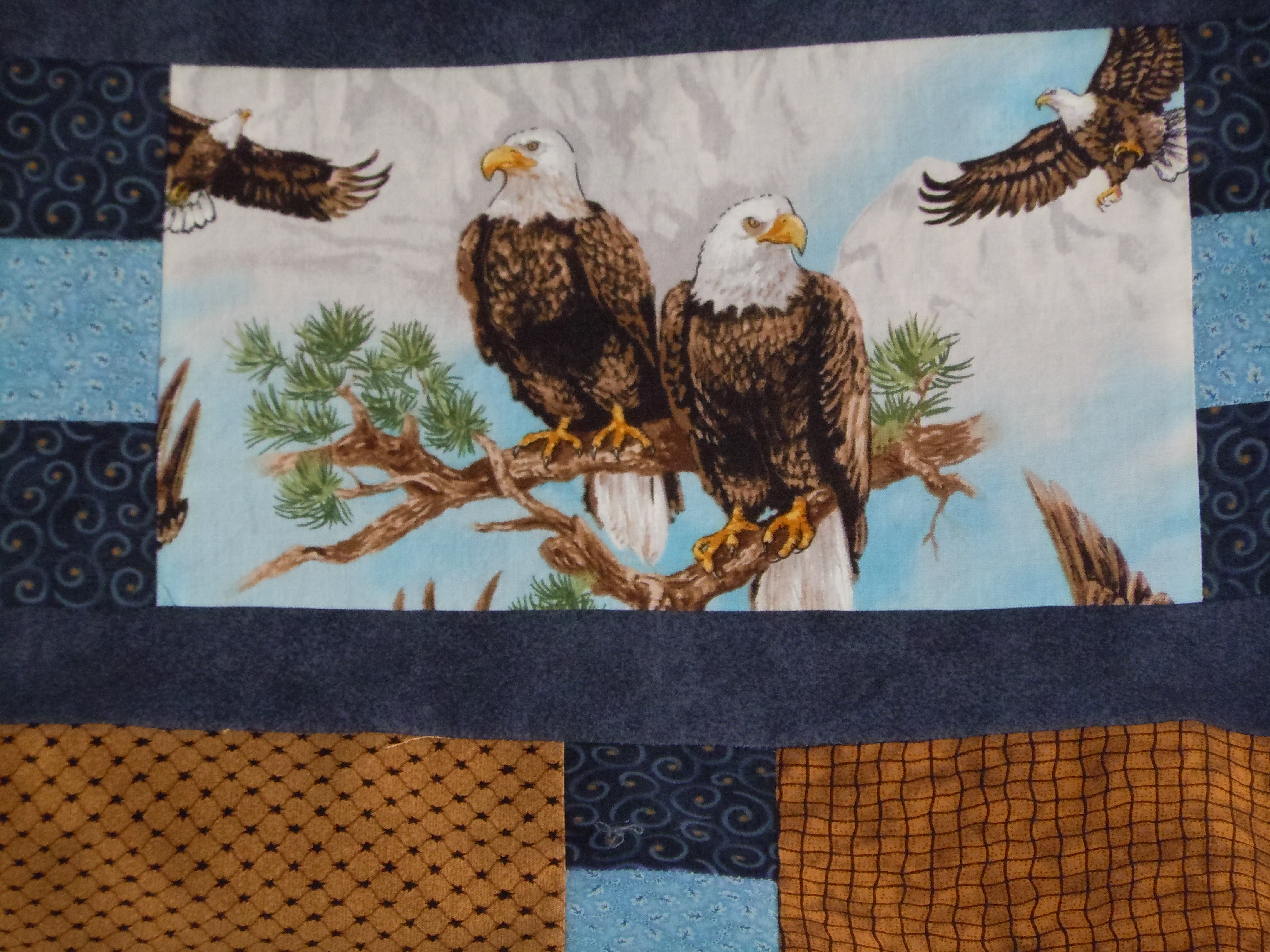 This winter I also pieced a top for one of the male groups, whoever needs it will get it, Veterans Groups, Homeless, etc.  It should quilt up beautifully and I’ll put the navy on the back.  I call it Flight Check.  The eagles are wonderful!  I have quite a bit of that fabric so you can bet it will go into more for the guys.