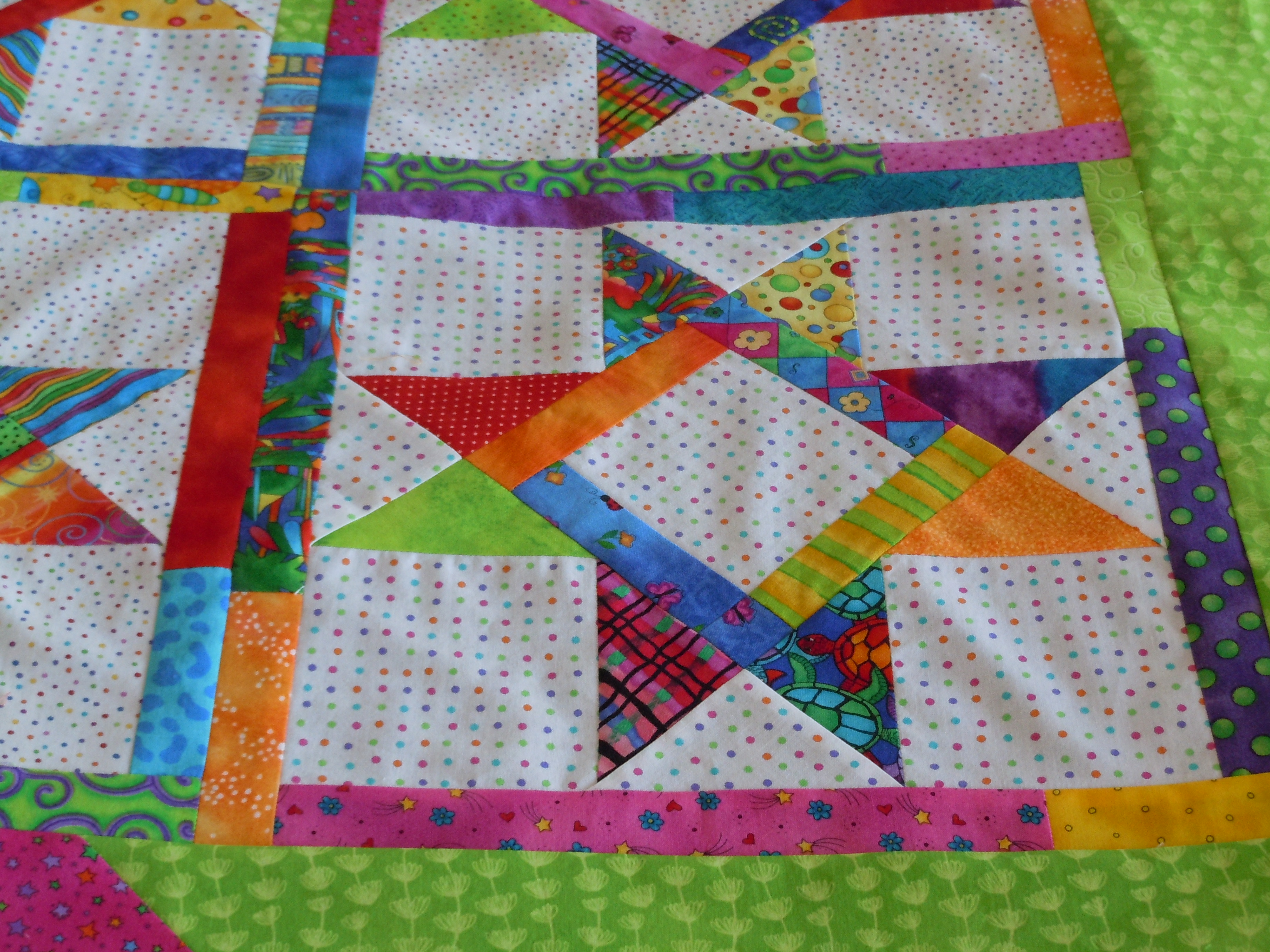 My “Happy Scrappy Stars” was another personal challenge after seeing these pieced stars on several blogs and Pinterest. With the bright fabric scraps from all of the youth quilts I’ve made these past 10+ years, I didn’t have to buy anything! Yes, the temptation was there and I can always find an excuse but it was nice to utilize what was at hand 🙂